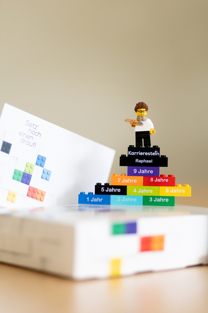 Kein Geschenk, sondern ein System: Der Karrierestein wächst mit dem Mitarbeitenden. Jeder stellt sich sein eigenes Mini-Double zusammen und startet mit einem personalisierten Sockel inklusive Namens- und Unternehmensstein. Zu jedem Jubiläum kommt automatisch ein neuer Jahresstein dazu – ohne neuen Aufwand, ohne jedes Mal neu zu denken.
